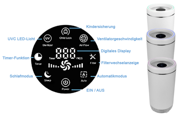 • Filterlebensdauer von ca. 6 Monaten • Hochpräziser PM-Sensor mit digitalem Display