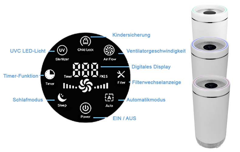 UV-LUFTSTERILISATION MITTELS UVC LED INKL. HEPA H13 FILTER 5-STUFIGE LUFTREINIGUNG ENTFERNT BIS ZU 99,5% ALLER VIREN UND AEROSOLE